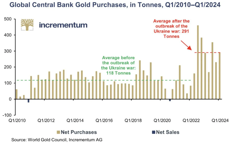ウクライナ侵攻に伴い、ロシアに対する資産制裁をみて多くの中央銀行がゴールドを購入している。中央銀行の買いが2022,2023と連続して1000トンを超えており、今年Q1もその傾向は続いている。この傾向はそう簡単に収まらないような気がする。