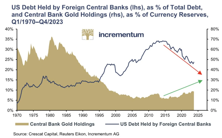 世界の中央銀行はこれまで外貨準備として米国債を持ってきたが、近年米国債を減らし、ゴールドを増やしている。