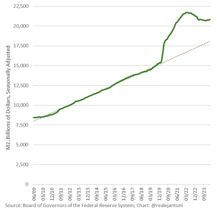 M2はコロナ騒動以前のトレンドを大きく超えて増加し始めている。これでインフレが納まると考えるのはあまりに楽観的だ。