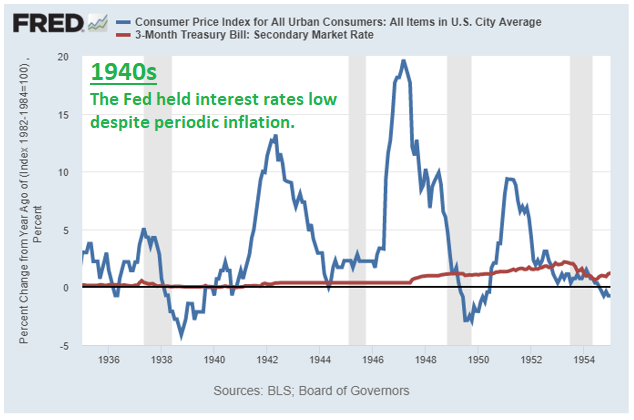 不況で株価が下落したときにはインフレは沈静化しましたが、その後の景気回復でまたインフレが再燃し、何度も高インフレに見舞われています。それでもFRBは低金利を維持しインフレを容認しています。これが金融抑圧です。