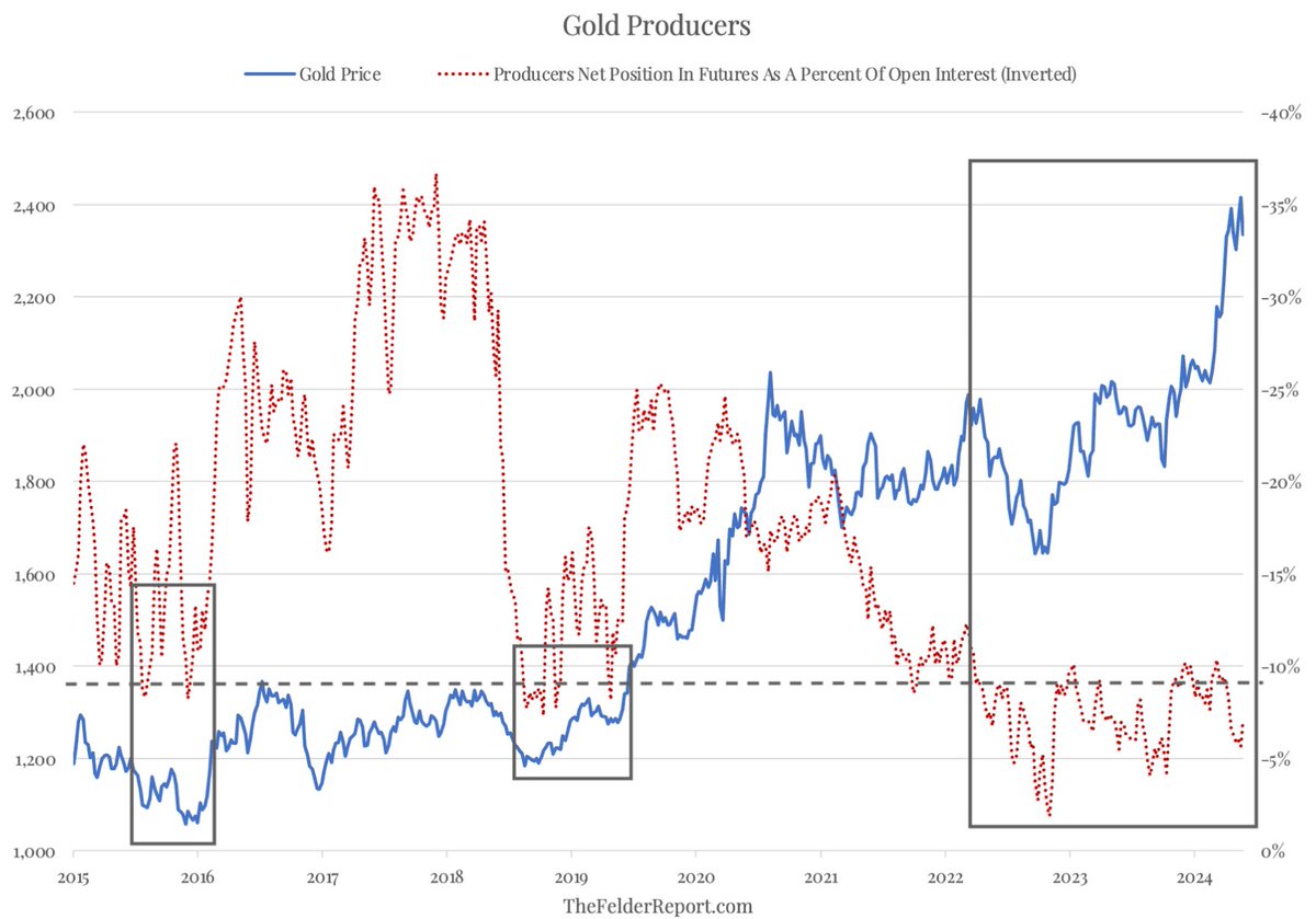 普段は投機筋のネットポジションしか見ていないのですが、CoTリポートのProducerポジションをみるとヘッジ量がとても少なくなっています。先物市場はもともとコモディティ業者が商品価格をヘッジすることを目的に開設されたものです。産金業者はゴールドに先安感があると何ヶ月か先のshortsでヘッジします。ところが最近のProducerネットポジション(ゴールドの売り手なのでネットショートですが)とても少なくなっています。彼らに先安感は無く、ヘッジに興味が無いようです。過去を振り返るとProducerのヘッジが少なかったのは2015年遅くと2018年遅くでした。